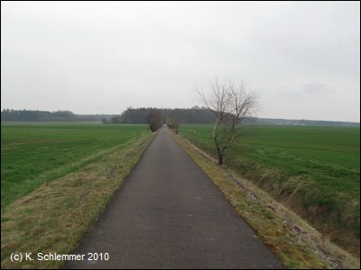 Wieder auf dem Radweg: Die Strecke knickt hier in einem großen Bogen nach Südosten ab. Entlang der B327 folgen wir der alten Bahnstrecke.
