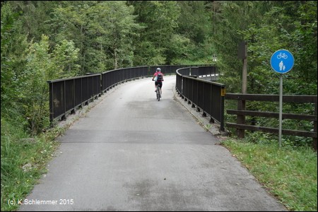 Wir befinden uns hoch über der Steyr, am Steyrdurchbruch. Gegenüber erkennt man die große Brücke der B140, 205 m lang und 35 m hoch. Wir fahren über die Bogenbrücke des Radwegs...