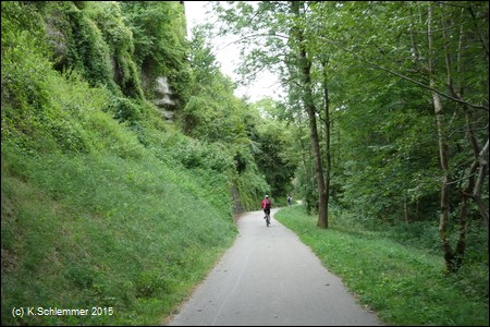 Danach wird die Strecke richtig schön! Durch die Wiesen und am Hang entlang hoch oberhalb der Straße verläuft der Radweg, wahrscheinlich auf der Bahntrasse.