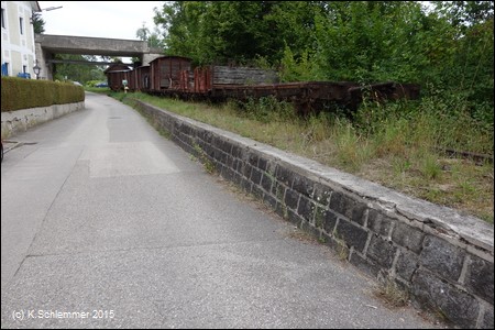 Ein paar alte Güterwaggons haben die Zeit überdauert, die Gleise liegen hier noch, sie enden an einem Prellbock auf einer kleinen Brücke. Kilometer 19,4 - noch 200 m zum Bahnhof Grünburg.