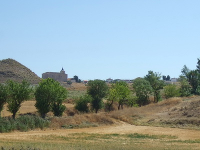 Bei Kilometer 3 zweigt die Straße nach Valdaracete ab. In der Ferne erkennt man die Silhouette des Dorfes mit der großen Kirche.