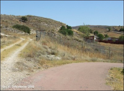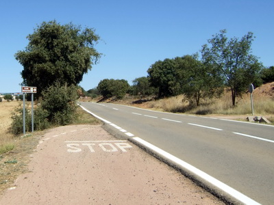 Stetig bergauf bei Kilometer 1 . Die wenig befahrene Landstraße begleitet die Vía Verde. Es folgt die erste (und einzige) Umfahrung. Ein verlassener Stierzüchterbetrieb versperrt den Zugang zur Trasse.