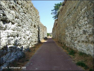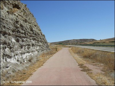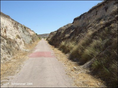 Der Radweg führt in eine einsame und karge Landschaft. Tiefe Einschnitte waren für den Bau der Bahnstrecke notwendig.