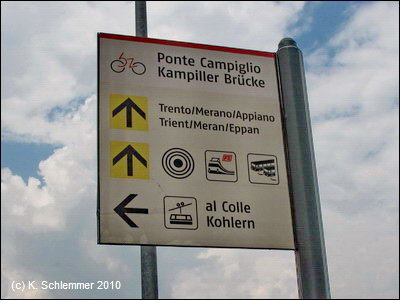 Wenn man aus nördlicher Richtung an der Eisack entlang nach Bozen fährt, ist der Radweg nach Eppan bereits ausgeschildert. Man fährt am Bahnhof Bozen vorbei und folgt dem Fluss abwärts bis zur alten Eisenbahnbrücke über die Talfer.