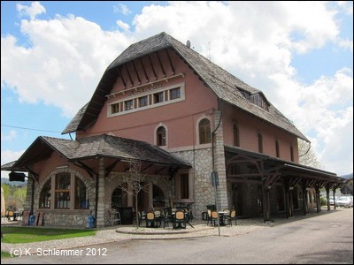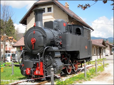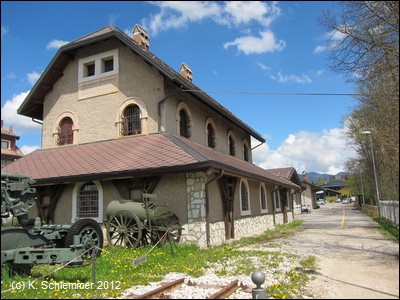 Einfahrt zum Bahnhof Canove. Eine "ortsfremde" Dampflok steht vor dem alten Gebäude unter freiem Himmel. Das Bahnhofsgebäude wurde zum Kriegsmuseum umfunktioniert.