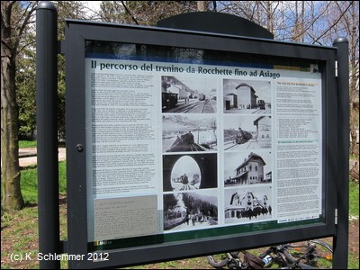Alessandro Rossi, ein Industrieller und Politiker(!) kam 1882 auf die Idee zu dieser für damalige Verhältnisse unglaublichen Bahnstrecke. Der Radweg führt weiter bergauf zum Scheitelpunkt bei Treschè Conca.