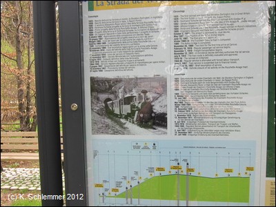 Geschichte und Bedeutung der Bahnlinie sowie ein Höhenprofil der ungewöhnlichen Strecke kann man sich ansehen, auch Bänke zum Ausruhen sind vorhanden: gut gemacht!