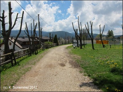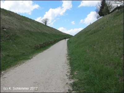 Es geht nun leicht bergab aus dem Ort heraus. Ein paar Straßen kreuzen den Radweg, der einmal asphaltiert, dann wieder ein Feldweg ist.