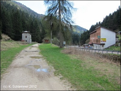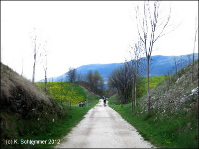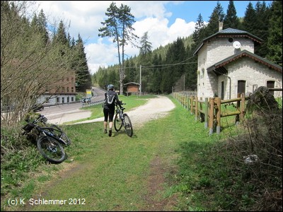 Auf der asphaltierten Piste geht es Stadt auswärts. Vorbei an der Käserei (Spezialitäten der Region Altopiano di Asiago) führt die Strecke in einem kurzen Anstieg wieder auf die alte Bahntrasse.