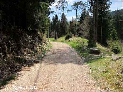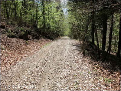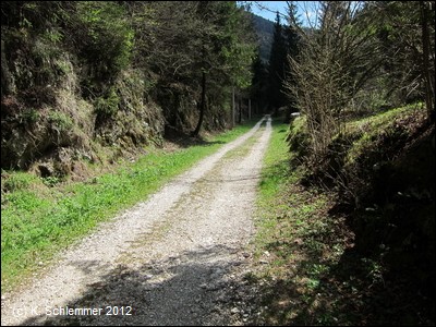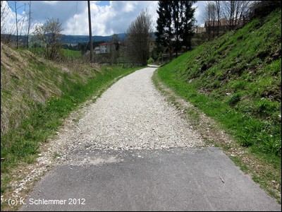 Die offizielle Strecke endet hier (Blick zurück). Aber der Waldweg auf der Trasse führt weiter talwärts.