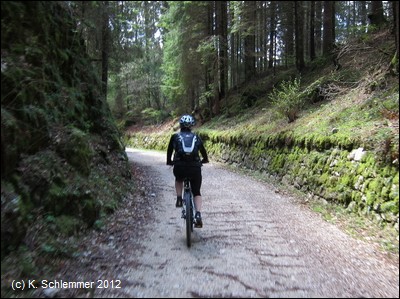 Jenseits der Straße führt die Trasse weiter steil abwärts durch den Wald. Wir beenden hier (vorerst) unsere Fahrt auf der Strada del Trenino...