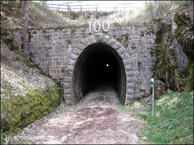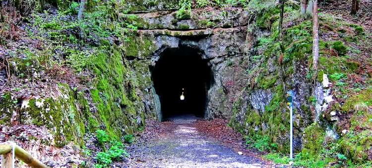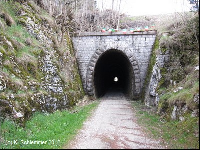 Im Ort ist die Bahntrasse überbaut. Unvermittelt zweigt der Radweg nach rechts ab. Dann steht man vor dem ersten Tunnel: Cesuna, 364 m lang, Ostportal.