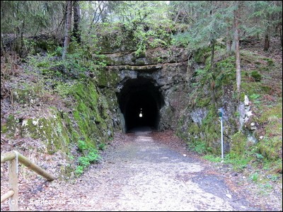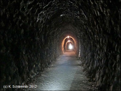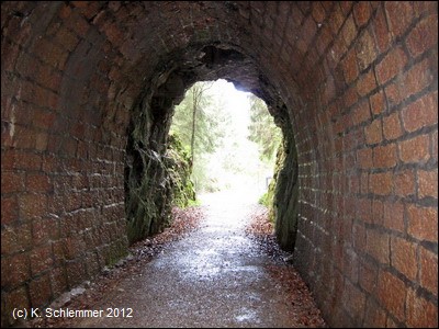 Vorsicht! Keine Beleuchtung. Blick zurück auf das Westportal des Tunnels.