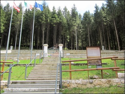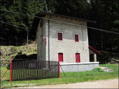 Vorbei am Friedhof von Campiello, der an die Gefallenen längst vergangener Kriegszeiten erinnert. Die Strecke wird steiler und sehr holprig, mit Steinen und Schotter. Ein verfalles Häuschen steht am Streckenrand.
