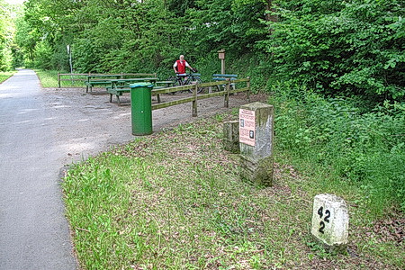 Vorbei am ehemaliger Haltepunkt Kleinropperhausen und zur Straßenquerung an der Schneidmühle führt die kerzengerade Trasse. Am "Helmut-Reich-Platz" erfährt man etwas über die Kilometrierung der Bahnstrecke: Die Steine standen im Abstand von 100 m neben den Schienen, die geraden links, die ungeraden rechts. Sie geben die genaue Entfernung vom Bahnhof Bad Hersfeld aus an (Gesamtstrecke 59,8 km).