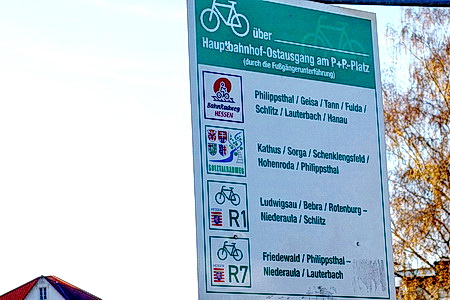 In Bad Hersfeld verlässt man den Bahnhof auf der Südostseite (Viadukt) und folgt der Beschilderung des R1/R7 Richtung Niederaula.