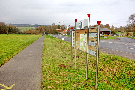 Etwas abseits liegt der alte Bahnhof von Kirchheim. Der Zugverkehr ist lange eingestellt, der Bahnhof wird anderweitig genutzt. Am Ortsausgang von Kirchheim steht eine Infotafel mit den roten Häubchen, der Radweg folgt zunächst der Bundesstraße 454.