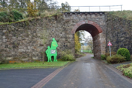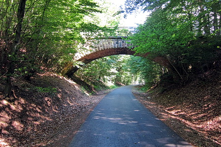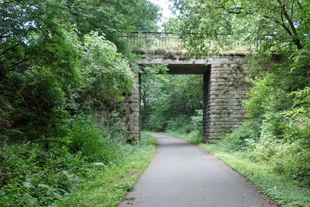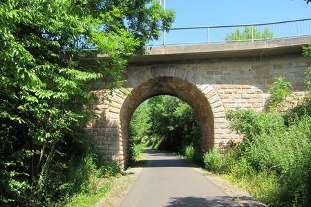 Zeitweise fuhren hier wohl noch Dampfloks? Zuerst geht es unter dem Durchlass hindurch, dann hinauf auf die asphaltierte Trasse.