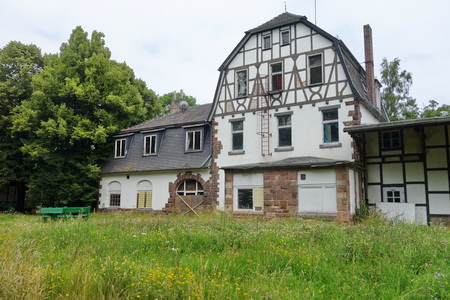 Bald taucht der große Bahnhof von Oberaula auf. Das altehrwürdige Gebäude ist in traurigem Zustand, der zunehmede Verfall ist nicht zu übersehen (Foto 2016).