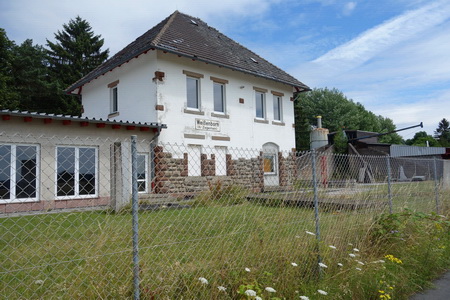Das Bahnhofgebäude von Nausis ist gut erhalten und dient als Wohnhaus. Vor der Stadt Neukirchen beobachten uns vom Rande der Trasse aus uns einige hölzerne Gestalten (Die Zuschauer von Kurt Makowski).