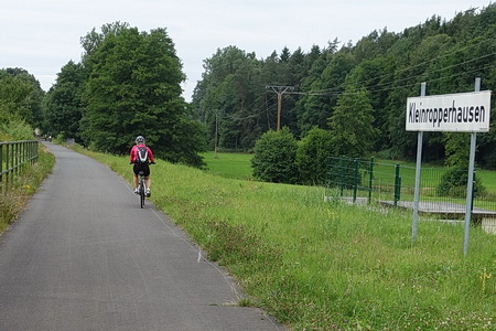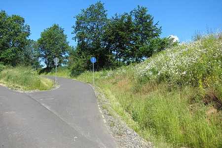 An der nächsten Straßenkreuzung wird der Ortsrand von Treysa erreicht. Dichte Vegetation begleitet die Trasse in einer Linkskurve Richtung Bahnhof. Nach einer kleinen Brücke endet der Radwegs am Parkplatz Haaßehügel.