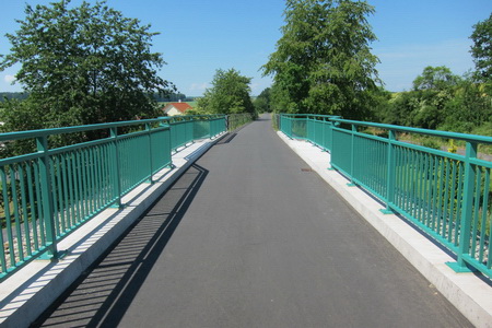 Der nächste Ort ist Riebelsdorf. Eine rostige Eisenbrücke überquert den Radweg.
