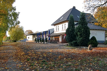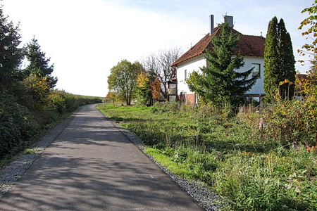 Das Bahnhofsgebäude (Wohnhaus) versteckt sich hinter den Bäumen, hier beginnt der jüngste Abschnitt des Radwegs. Eine kleine Brücke wurde erneuert.