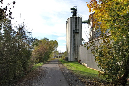 Der Radweg führt an den riesigen Silos eines Lagerhauses vorbei und wieder über eine Straße.
