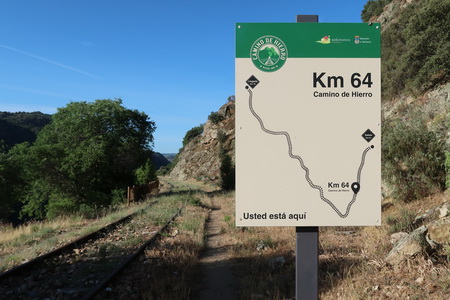 Hier kreuzt ein vergessener, kaum noch vorhandener Weg die Trasse: Camino de Segaverde. Nur noch ein Warnschild vor dem Zug ist erhalten geblieben, aber der Name deutet auf eine etwas fruchtbarere Landschaft am Bachlauf des Arroyo del Cabrero hin, die vielleicht einst landwirtschaftlich genutzt wurde. Hier existierte auch ein Weg zum bereits beschriebenen Wasserturm La Torreta", der im Blick zurück auf dem Bergrücken in der Ferne zusehen ist.