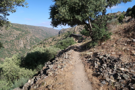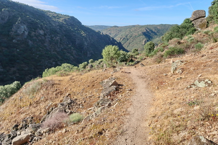 Vorbei an einer Viehweide und durch einen tiefen Felseinschnitt folgt man der Trasse, die hier eng am Steilhang verläuft und durch ein Geländer gesichert ist. Tief unten im Tal hat sich der Grenzfluss Río Àgueda sein Bett in die Felsen gegraben.