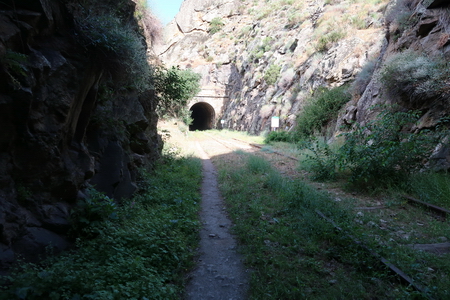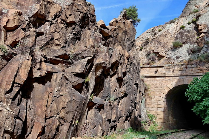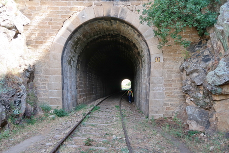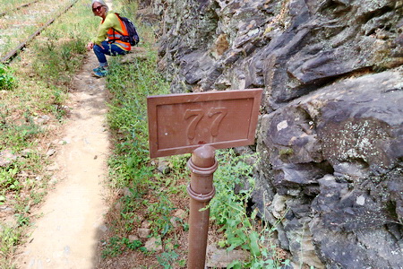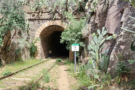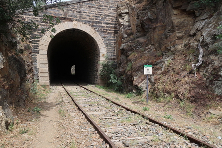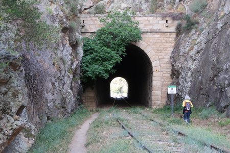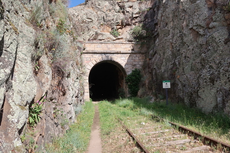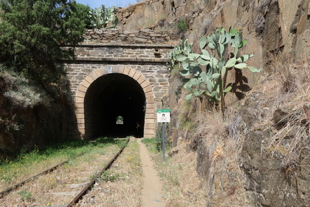 Der gleichnamige Tunnel (Nr. 19) ist nur 73 m lang. Er führt noch einmal in eine felsige "Schlucht". So langsam spüren wir unsere Beine, das Gehen auf dem steinigen Pfad oder den Bahnschwellen hat seinen Preis.