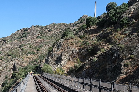 Dafür ist der 3. Tunnel (Morgado) wieder länger, ganze 423 m, aber wegen der Fledermäuse in diesem Jahr noch gesperrt. Wir folgen der Umgehungsstrecke (1,3 km). Der Tunnel verläuft in einer langen Kurve, die Bahnstrecke führt nun nach Nordwesten und folgt dem Río Águeda, der den Río Morgáez aufgenommen hat.