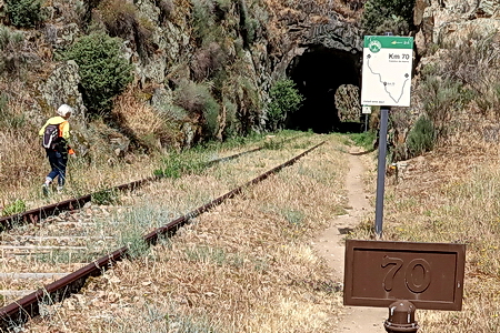 Er ist 1593 m lang! Damit ist er etwa 60 m länger als der längste Bahnradwegetunnel in Deutschland (Küllstedter Tunnel, Thüringen, 1530 m, Kanonenbahn-Radweg ). Man sieht nur den winzigen Lichtpunkt des Portals am anderen Ende, sonst ist es sehr dunkel! Gut dass wir die Lampen haben. Kilometer 63 befindet sich im Tunnel. Die Kilometrierung beginnt in La Fuente de San Esteban-Boadilla (Kilometer Null), Bhf. Fregeneda Kilometer 61,021. Internationale Brücke km 77,565. Genau 16.54 Kilometer ist der Wanderweg lang, (ohne die Umgehung von Tunnel 3, der im Mai 2023 noch zum Schutz der der Fledermäuse gesperrt war).