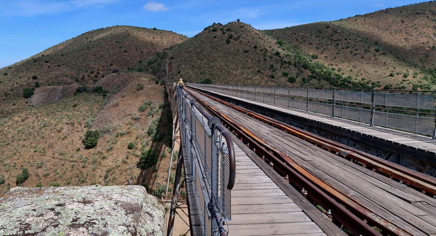 Das Viadukt Los Riscos ist "nur" 71 m lang, zwei Pfeiler tragen die Gitterkonstruktion. Einer der beiden hölzernen Stege ist gesperrt (2023).