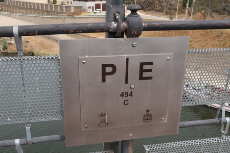 Drei mächtige Steinpfeiler tragen die Eisenkonstruktion an dem steilen Abhang zum Fluss. Rechts oberhalb auf dem Berg erkennt man erstmals einen merkwürdigen Turm.