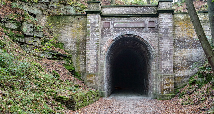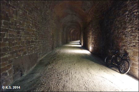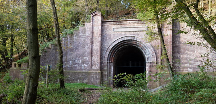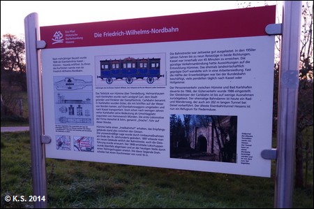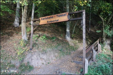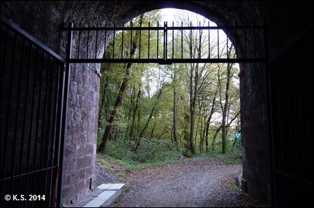 Wir sind am Abzweig zum Deiseler Tunnel angekommen. Nur eine Infotafel steht hier, ein Wegweiser fehlte 2014 noch. Ein kurzes Stück links ab, dann steht man vor dem Nordportal des ältesten Eisenbahntunnels von Hessen.