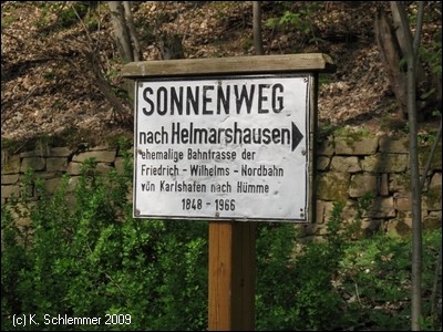 Der Ort, 1699 von Landgraf Carl als „Sieburg (Syburg)“ gegründet und erst 1717 umbenannt, liegt malerisch am Weserufer und hat eine sehenswerte barocke Altstadt. Da der Radweg kein eigenes Logo hat, folgt man den Wegweisern des Hess. Radfernwegs R4 Richtung Helmarshausen. Am Ortsende erkennt man linker Hand die Überreste der aufgegebenen Bahnstrecke, etwa einen halben Kilometer weiter wechselt der Radweg auf die Trasse. „Sonnenweg“ heißt dieser Abschnitt bis Helmarshausen, der herrlich am Waldrand und am Ufer der Diemel entlang führt. Die beschilderte Strecke durch Helmarshausen verläuft abseits der Bahnstrecke, obwohl diese noch bis in den Ort befahrbar ist. Hier findet man die Wegweiser des Diemelradwegs (R8). Hoch über dem Fluss thront die Krukenburg und verspricht herrliche Ausblicke über die Landschaft. Am Ortsausgang verrät ein restaurierter Kilometerstein (Nr. 13), dass man wieder auf der Trasse ist. Etwa 3 ½ km bis zum Haltepunkt Wülmersen (das Wartehäuschen ist noch erhalten) fährt man am Waldrand entlang, begleitet von der Diemel und einigen mutigen Kanufahrern.