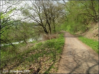 Feuchtbiotop im Naturschutzgebiet Holzape. Noch ein Stück entlang des Flusses, dann biegt der Radweg wieder links ab auf die Bahntrasse.