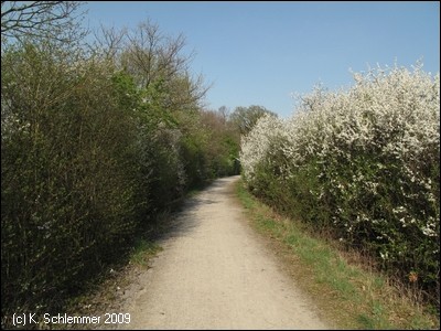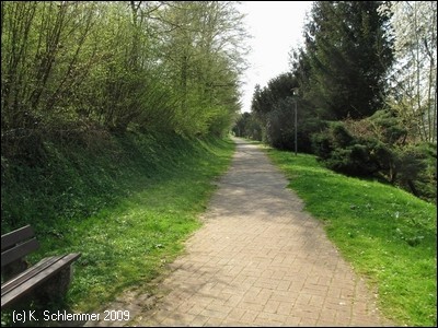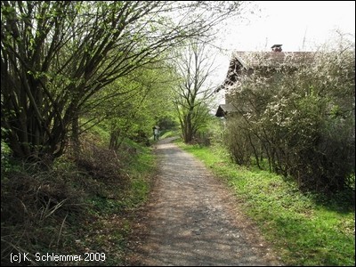 Ein asphaltierter Abschnitt führt durch die Schrebergärten, die Bahntrasse linker Hand (Kilometerstein 13)