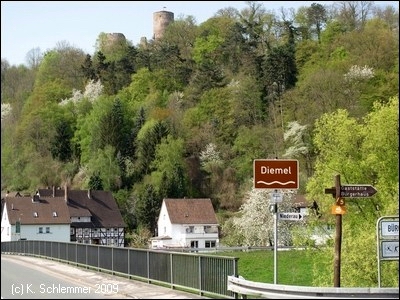 Rechter Hand, auf der anderen Diemelseite, befindet sich hoch oben auf dem Berg die Ruine der Krukenburg.