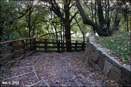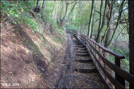 Wegen des Naturschutzgebietes endet hier für etwa 750 m die Fahrt auf der Trasse: eine steile Treppe führt hinab zur Diemel.