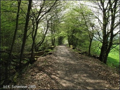 Durch eine Birkenallee führt der Weg auf das Viadukt über die Holzape.