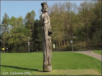 Weiter geht es entlang der Diemel: Die Statue der Riesin Trendula an der Diemelbrücke. Abseits der Bahntrasse über die Wiesen erreicht man Stammen.