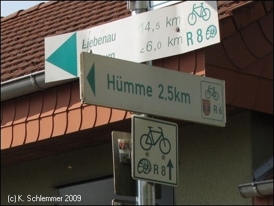 Kerzengerade geht es Richtung Hümme. Dann trifft man wieder auf die Bahntrasse: rechts abbiegen Richtung Bahnhof, geradeaus weiter, wenn man auf dem R4 bleiben will.