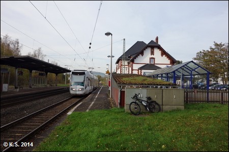 Am Wegesrand vor dem Ortseingang informiert noch einmal eine Tafel über die Geschichte der Bahnstrecke. Dann erreicht man den aktuellen Bahnhof.