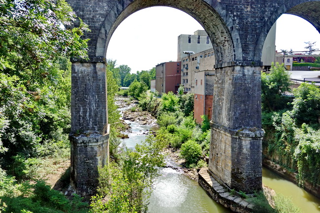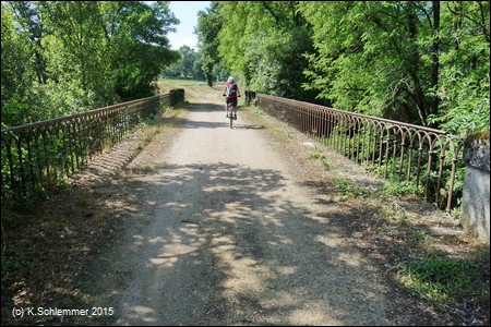 Auf einer alten Steinbrücke überquert der Radweg den Fluss Dadou, ....