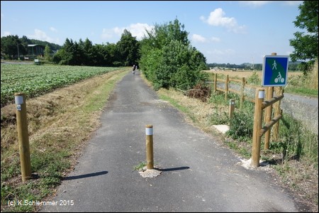 An den Straßenquerungen die üblichen Pfostensperren..... hier auch mit schlecht sichtbarer Sperrkette (re. Bild)!