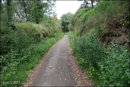 Die Fahrt auf der Trasse beginnt. Leicht bergauf geht es am Hang entlang.