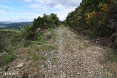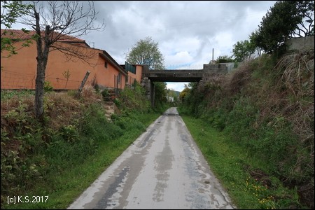 An dem kleinen Ort vorbei, auch der folgende Abschnitt ist durch eine massive Sperre vor Autos geschützt. Tief unten überquert die Schnellstraße den Fluss.