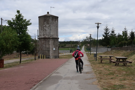 Einfahrt in den Bahnhof von Sabroso de Aguiar. Der alte Wasserturm hat die Zeit überdauert.
